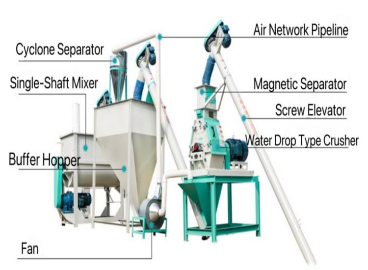 A complete animal feed manufacturing plant includes pre-cleaning system, crushing system, mixing system, pelletizing system, cooling system, screening system, and packing system.